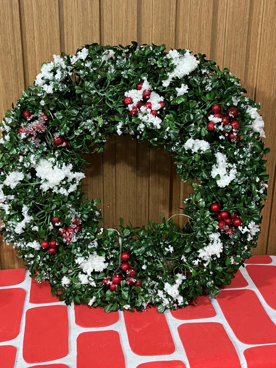 Guirlanda natalina verde com efeito nevado, 35cm de diâmetro. Perfeita para decorar portas, paredes e ambientes com o charme do Natal. O efeito de neve artificial traz um toque especial e aconchegante.