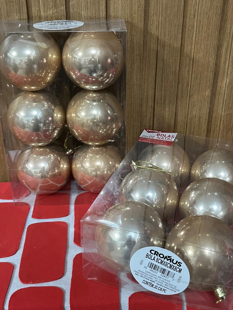 Jogo de bolas natalinas champagne com acabamento brilho e fosco com glitter, 8cm cada. A cor champagne traz sofisticação e elegância, perfeita para decorações natalinas modernas e refinadas.