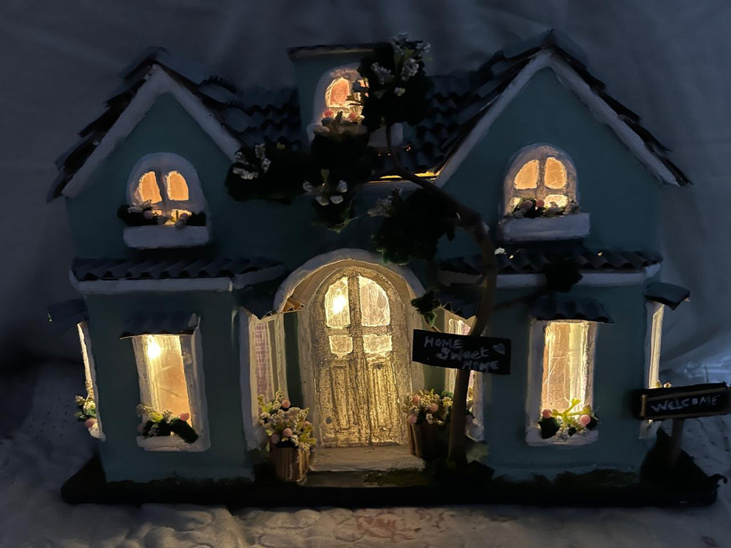 Casa decorativa Home Sweet Home com iluminação LED, 40cm de altura. Peça acolhedora que transmite o sentimento de lar com luz e charme. Perfeita para decorar ambientes durante o Natal, trazendo calor e aconchego para sua casa.