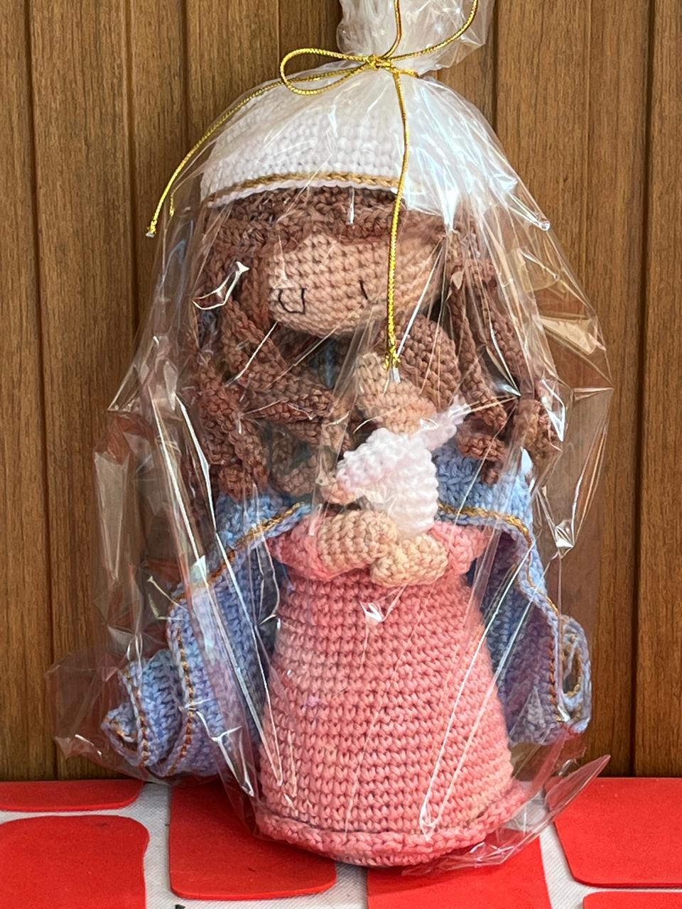Amigurumi artesanal de Nossa Senhora do Menino Jesus. Peça única feita em crochê com detalhes delicados e acabamento especial. Perfeita para decoração religiosa, presentes especiais e colecionadores de peças artesanais de fé.